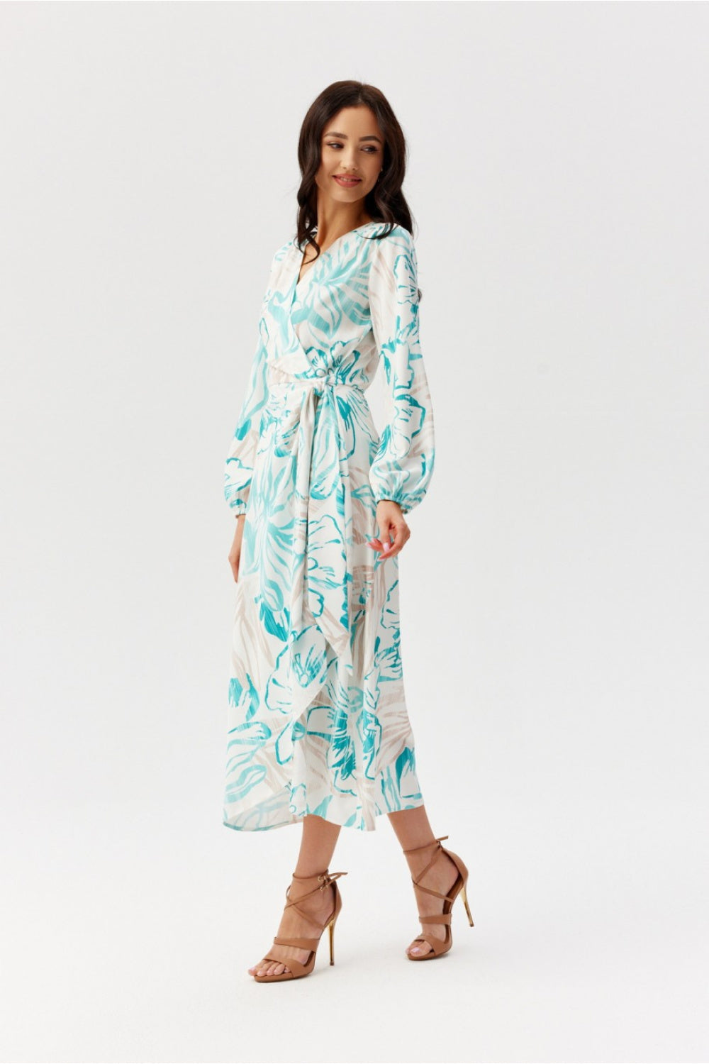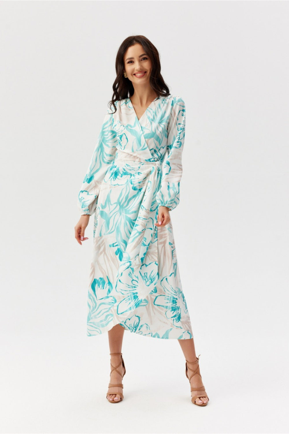 Vestido midi de manga larga. Parte superior cruzada y bajo ligeramente acampanado. Sin forro y con doble lazo en la cintura.
