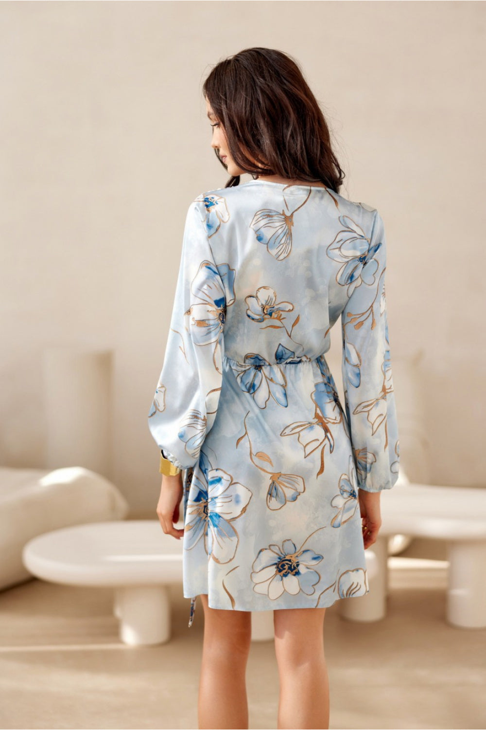 Minivestido de manga larga. La parte superior es cruzada y la inferior ligeramente acampanada. No lleva forro y se abrocha con un lazo doble en la cintura.