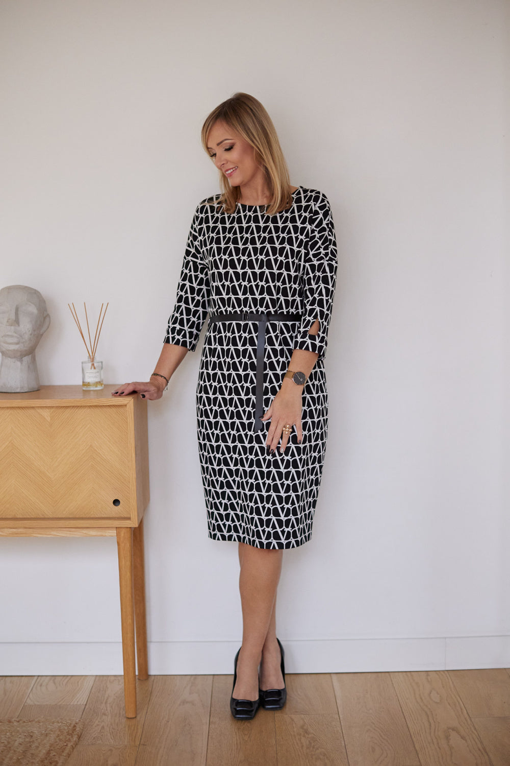 Vestido muy femenino y cómodo, confeccionado en tejido de punto jacquard con elastano añadido. Diseñado según los principios de la marca LAAURORA, pensando en la mujer madura. Top tipo kimono con mangas drapeadas, cinturón elástico con una gran hebilla decorativa para ajustar la cintura, colores tenues y un tejido suave y flexible de aproximadamente 280 g/m². Todo esto lo hace perfecto para tallas grandes.