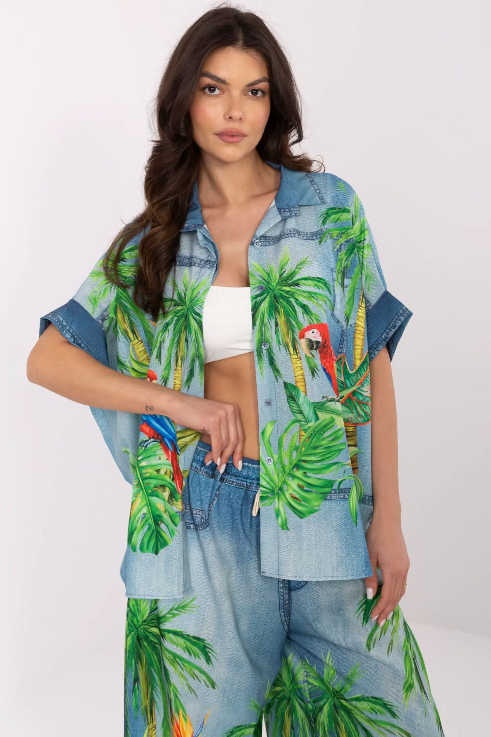 Camisa informal para mujer, perfecta para el día a día, con un estampado colorido que aporta energía y estilo. Hecha de viscosa con una mezcla de poliéster, ofrece comodidad y transpirabilidad, ideal para los días más cálidos. La camisa tiene un largo asimétrico, mangas cortas con puños enrollados y cuello clásico, lo que le da un aspecto elegante. El cierre de botones en la parte delantera facilita su colocación y le aporta practicidad. Esta camisa es una excelente opción para las mujeres que aprecian la comodidad y el estilo diario.