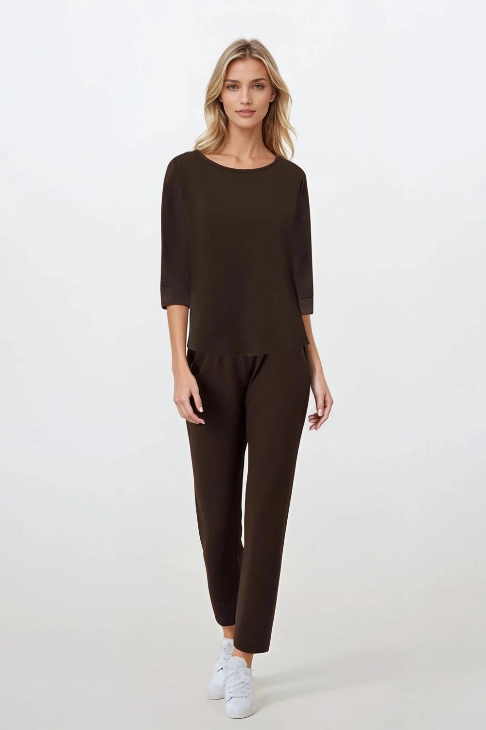 Este pijama de dos piezas combina un estilo femenino con comodidad y elegancia, perfecto tanto para relajarse por la noche como para estar en casa. La blusa con mangas 3/4 y escote en U crea una silueta sutil pero femenina, y los puños con puños le aportan un toque clásico. Confeccionado en tejido suave y transpirable, es hipoalergénico y cuenta con la certificación OEKO-TEX Standard 100, que garantiza su seguridad para la piel. Los pantalones ajustados, de pernera larga y cintura elástica, se ajustan perfectamente a la silueta, y la ausencia de bolsillos y el corte minimalista le aportan ligereza. El producto está fabricado con materiales 100 % naturales y diseñado y confeccionado en Polonia, lo que garantiza la máxima calidad de fabricación.