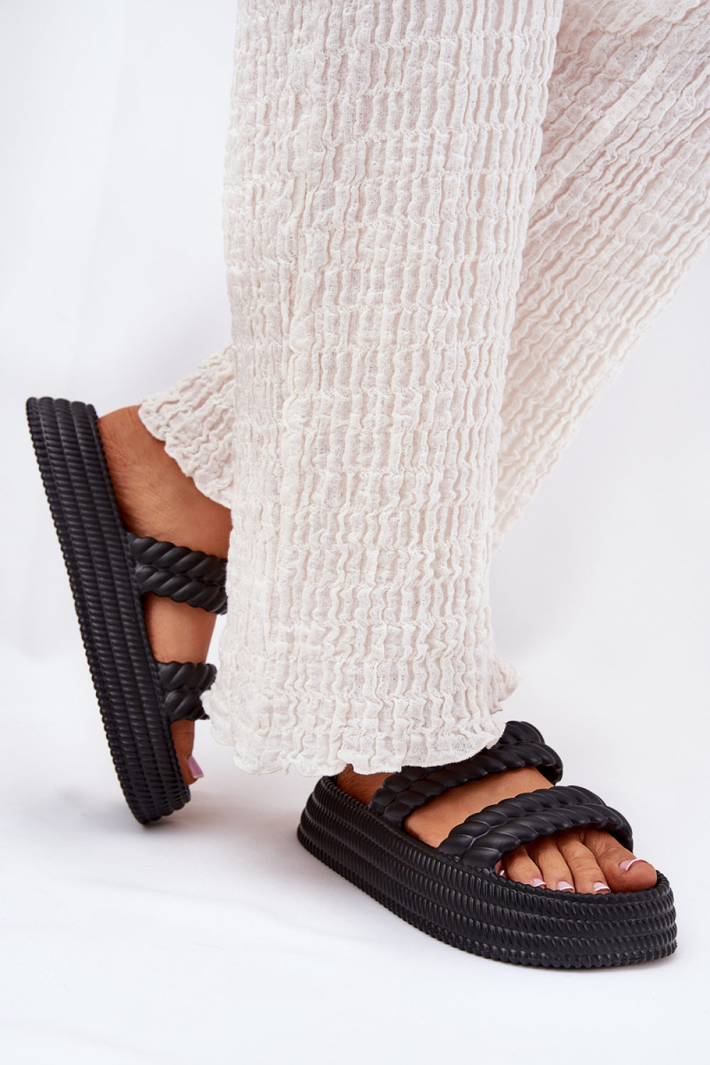 Chanclas para mujer fabricadas en espuma ligera, con plataforma que ofrece comodidad durante todo el día. Dos correas delanteras proporcionan estabilidad y confianza al caminar. Perfectas para días calurosos, estas chanclas son una excelente opción para vacaciones, la piscina o la playa, ya que combinan funcionalidad y comodidad.