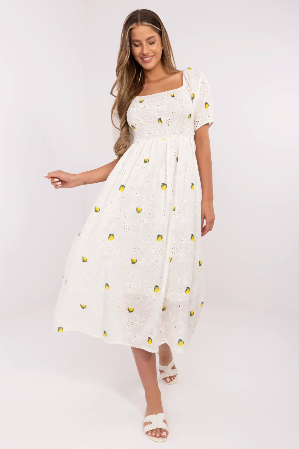 Este impresionante vestido de verano de estilo bohemio es la elección perfecta para los días cálidos de todos los días. Confeccionada en algodón transpirable, combina ligereza, feminidad y diseño original. El modelo acampanado de largo midi se adapta maravillosamente al movimiento, garantizando comodidad y libertad. El sutil estampado de encaje y el estampado de limones aportan frescura y encanto veraniego al vestido, mientras que el escote rectangular y el fruncido en la parte superior aportan un toque romántico al conjunto. Las mangas cortas y la falta de cierre hacen que el vestido sea fácil de poner y cómodo de llevar durante todo el día. Una ventaja adicional son los bordados y forros decorativos, que aportan comodidad y un acabado elegante. Este vestido está diseñado para las amantes del estilo natural con un claro acento veraniego.