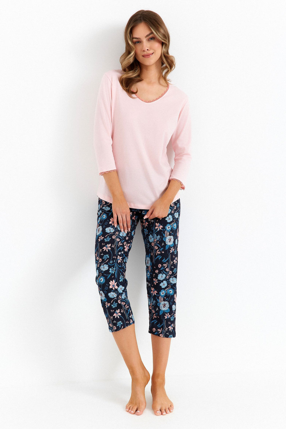 Pijama elegante para mujer que combina comodidad y elegancia. El top con escote en V presenta un sutil acabado de encaje, al igual que las mangas 3/4, lo que le da un toque romántico. Su corte holgado y prácticos bolsillos aumentan la comodidad. El conjunto incluye un pantalón 3/4 con un estampado moderno. Una banda elástica en la cintura garantiza un ajuste cómodo. Una propuesta ideal para mujeres que aprecian los detalles sutiles y la comodidad.