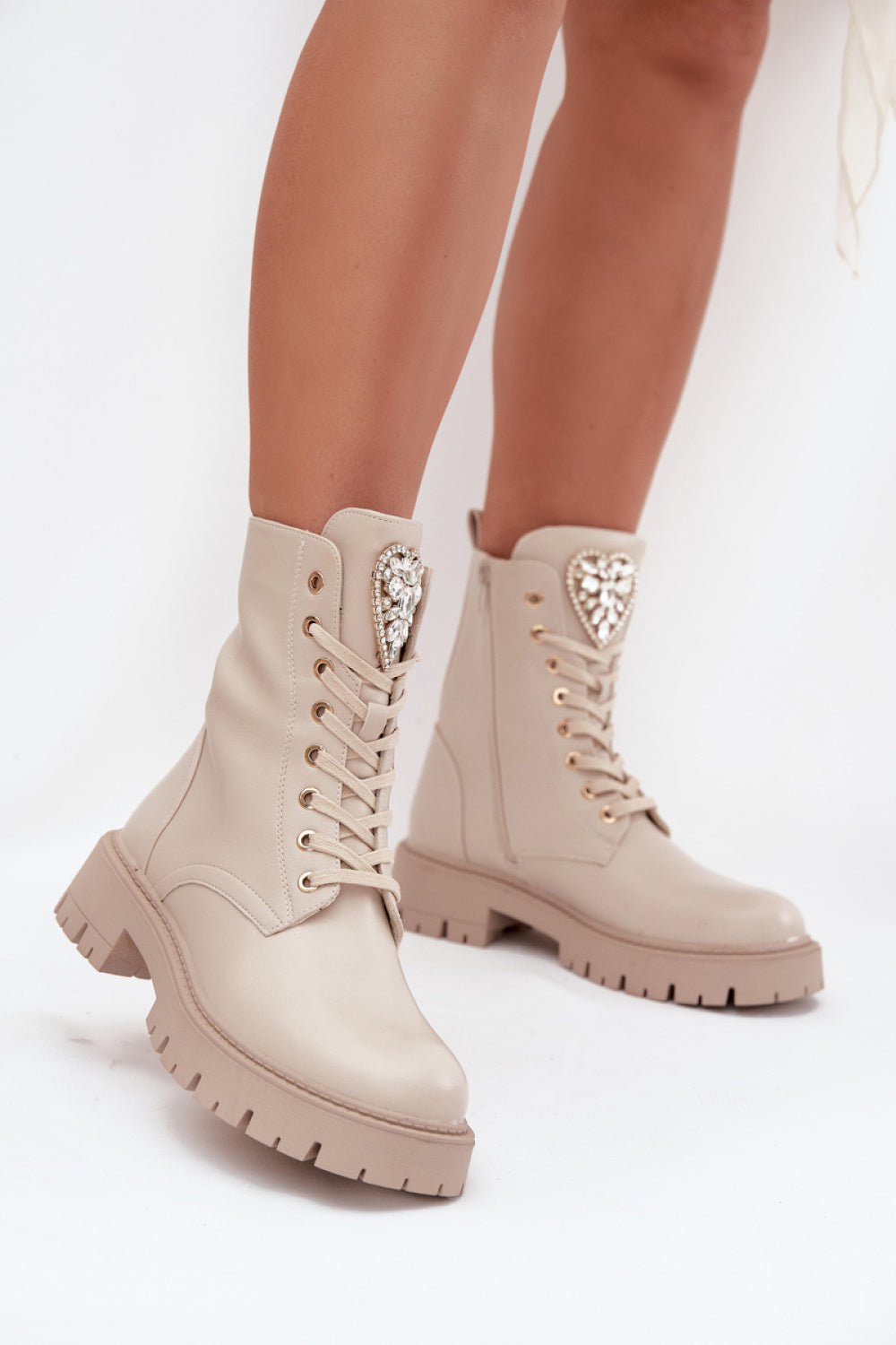 Los botines para mujer de piel ecológica son una propuesta encantadora que combina comodidad con un detalle moderno. El modelo con cierre de cordones y cremallera garantiza una colocación fácil y un ajuste perfecto al pie, mientras que el corazón decorativo con cristales en la lengüeta aporta un toque sutil y femenino, complementando a la perfección los looks del día a día.