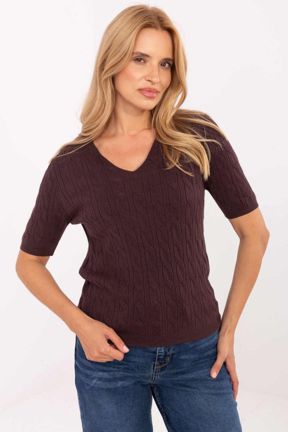 Suéter casual para mujer, confeccionado en una mezcla flexible de viscosa, poliéster y poliamida, que garantiza comodidad y ligereza. El escote en V le da a la silueta una sutil elegancia, y las mangas cortas lo hacen perfecto para el día a día y para el trabajo. La variada textura del material le da un toque interesante, y su largo estándar permite combinarlo fácilmente con diversos pantalones y faldas. Un modelo sin cierre, sencillo y versátil, perfecto para looks casuales y de negocios.