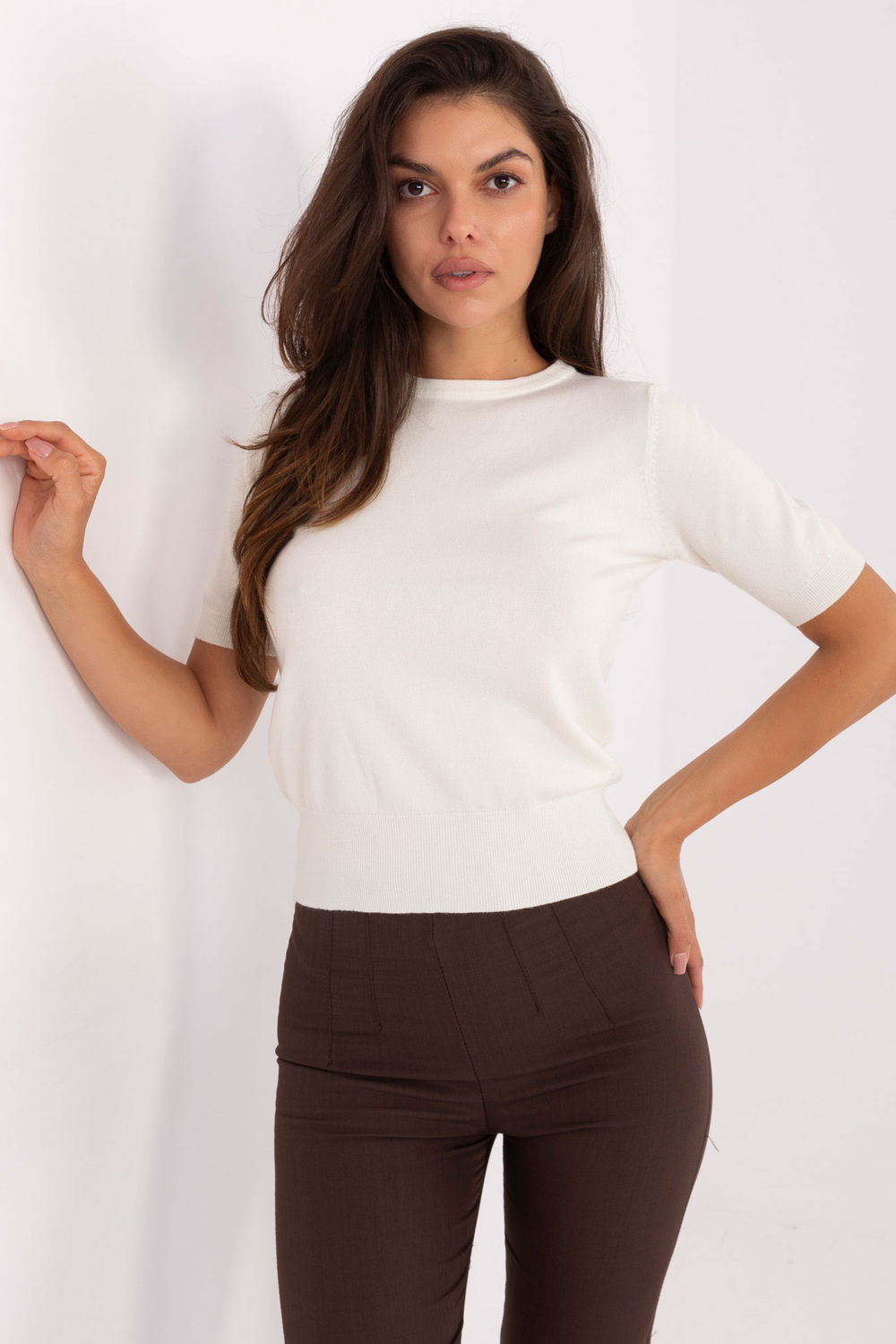 Suéter clásico de mujer de estilo casual, perfecto para el día a día y para el trabajo. Confeccionado en una suave y elástica mezcla de viscosa, elastano y nailon, garantiza comodidad y un ajuste perfecto. Este modelo de largo estándar, manga corta y cuello redondo es una prenda versátil para cualquier temporada. Con un estampado suave y dominante, combina a la perfección tanto con atuendos sencillos de diario como con looks más elegantes para la oficina.