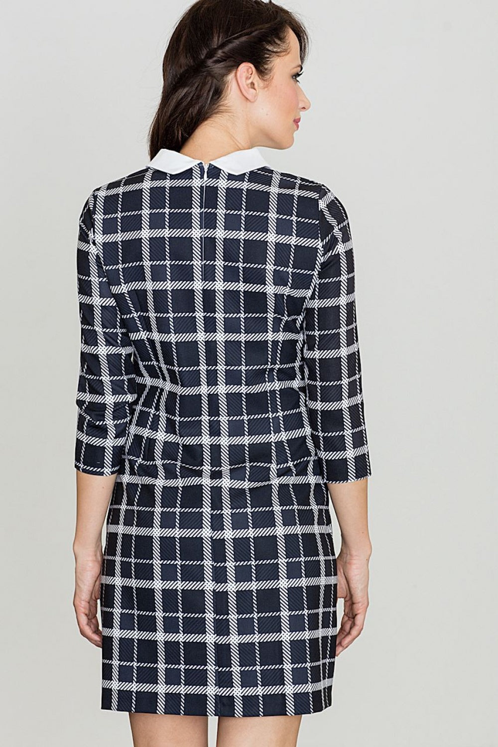 Vestido midi clásico con estampado geométrico de cuadros, cuello decorativo y mangas 3/4. Ideal tanto para el trabajo como para el día a día.