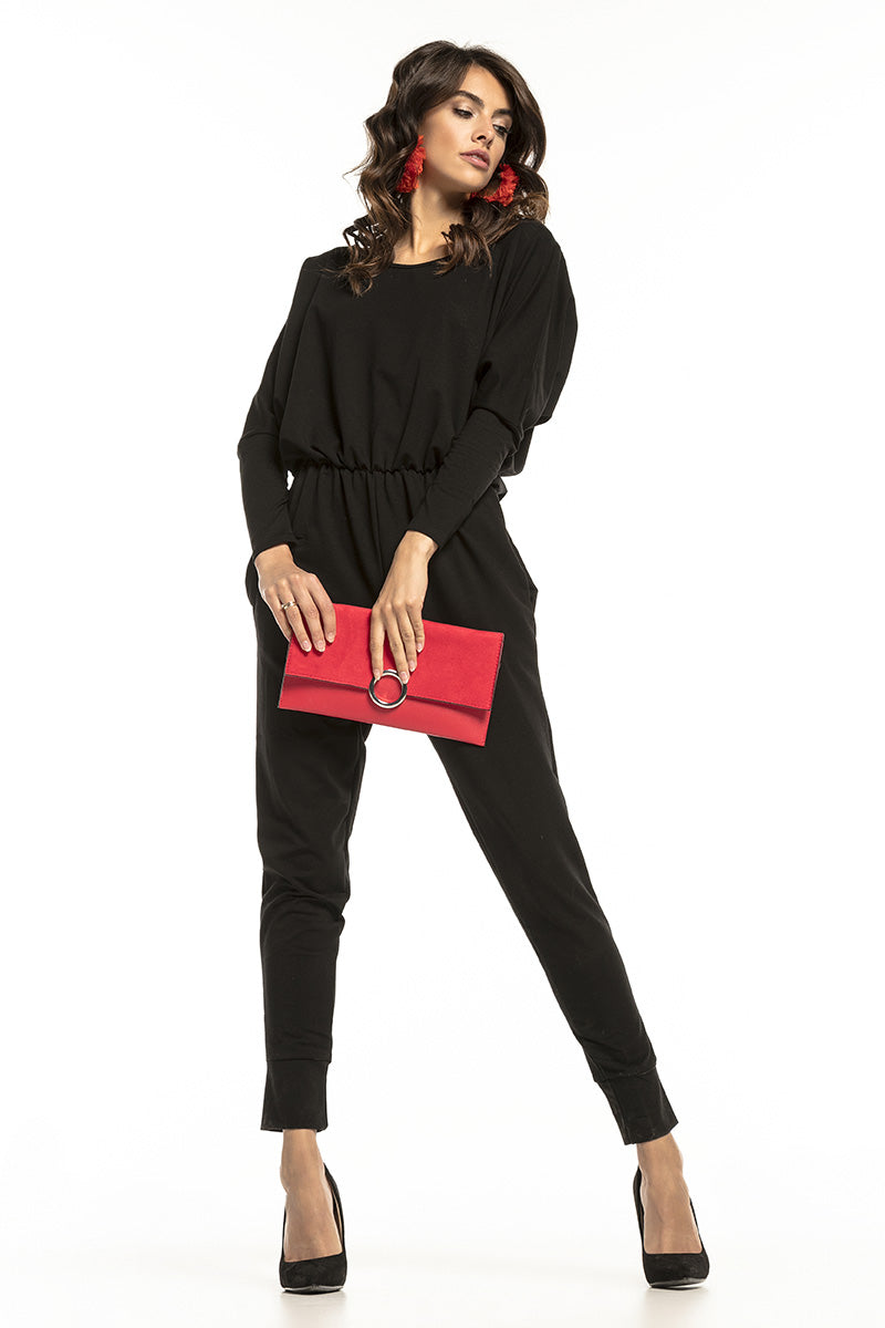 Mono elegante de punto de algodón con bolsillos. La parte superior del traje es muy amplia, de corte kimono. En la espalda abertura vertical y ribete. La cintura del traje se apretaba con banda elástica. Piernas rematadas con ribete ancho.