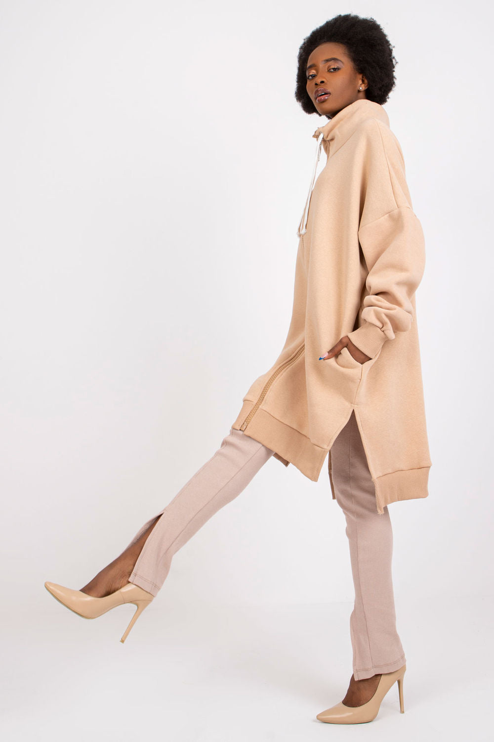 Sudadera de mujer de corte amplio con cremallera. Manga larga y cuello alto. Aberturas laterales y bolsillos en las costuras laterales.