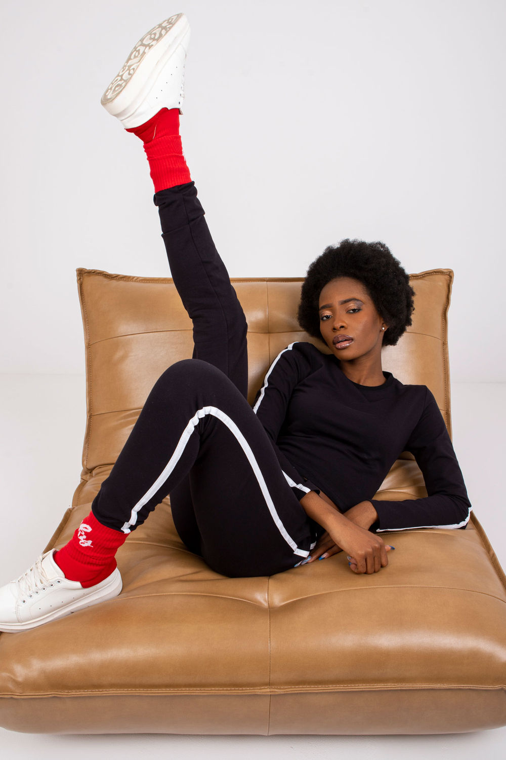 Conjunto compuesto por sudadera y pantalón largo. Blusa corta de manga larga y cuello redondo. Las mangas lucen un estampado de rayas en contraste. Pantalón largo a juego con bolsillos.