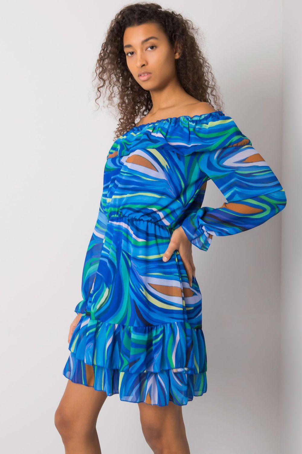 Vestido de manga larga y escote tipo español. Tiene forro y la parte inferior está decorada con volantes.