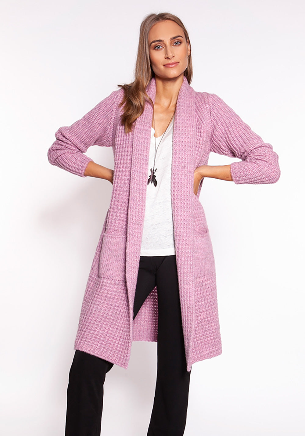 Abrigo tipo suéter con una interesante textura de gofre. El cuello chal envuelve suavemente el cuello y abriga en otoño e invierno. Práctico largo hasta la rodilla con bolsillos de parche. Hecho con hilo de la más alta calidad, te durará muchos años.