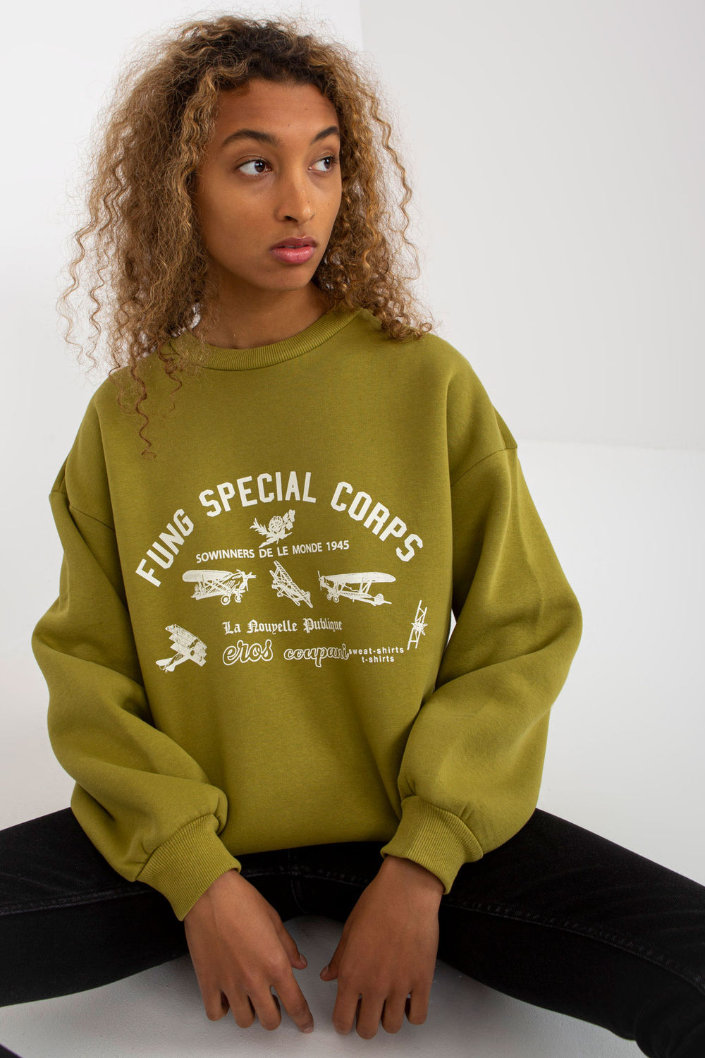 Sudadera de mujer de manga larga, por dentro por encima de la cabeza. Un estampado interesante en el frente.