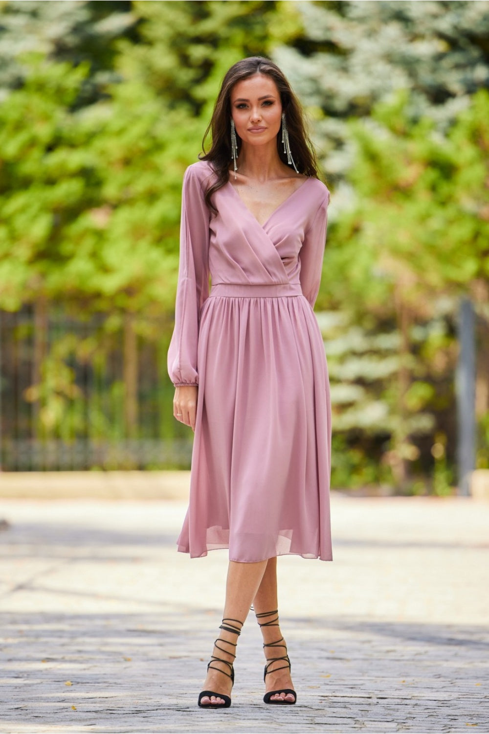 Vestido midi con mangas largas de ante. Las mangas están decoradas con grietas. El vestido presenta un escote envolvente y se estrecha en la cintura. Tiene cremallera en la espalda con una delicada abertura. El vestido tiene una enagua cosida para que la tela no se vea. El escote superpuesto acentúa tu cuello esbelto y la espalda al descubierto le da un toque femenino a tu estilo. Una opción perfecta para una boda u otra salida formal. El producto está fabricado y confeccionado en Polonia.