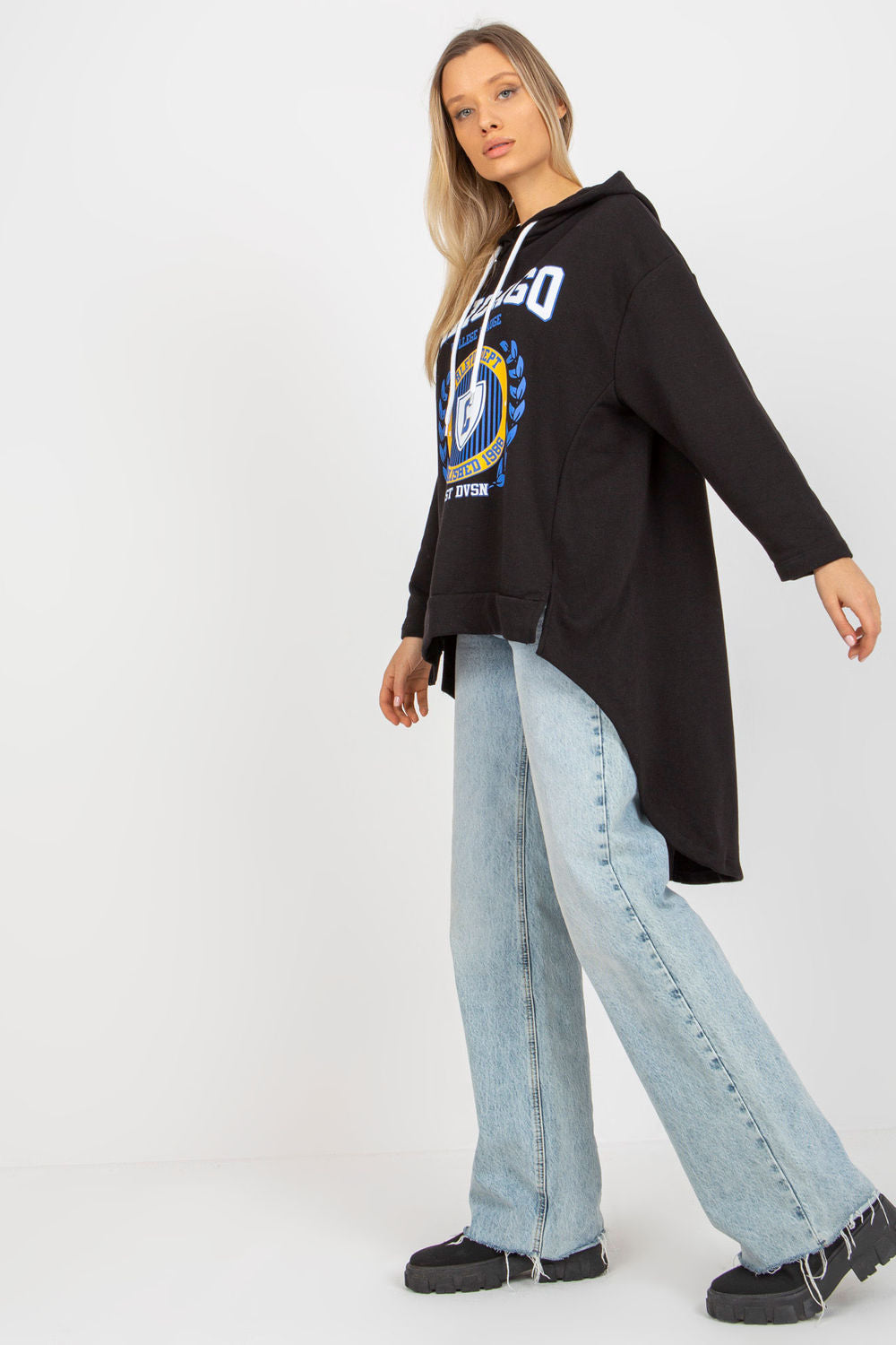 Sudadera de mujer de corte holgado asimétrico, manga larga y capucha.