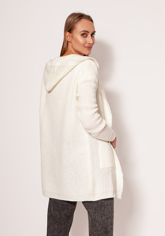 Abrigo de punto suave confeccionado en una fábrica familiar polaca. Corte minimalista con ribete fino, hombros caídos y bolsillos laterales.