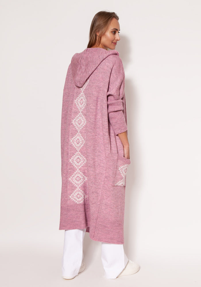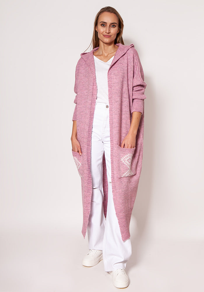Abrigo de punto suave, confeccionado en una fábrica familiar polaca. Corte alargado, con mangas largas, capucha y bolsillos.