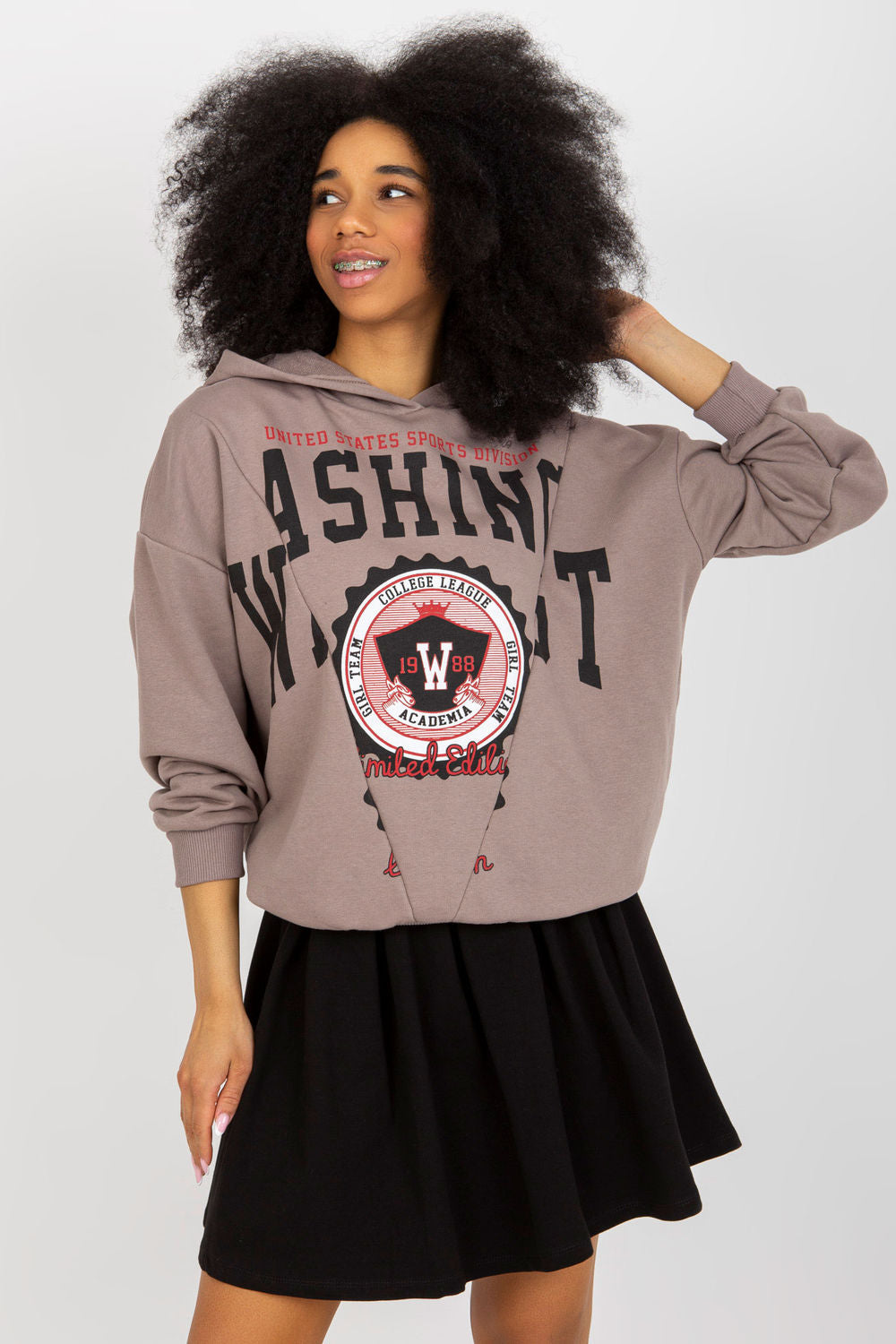 Conjunto de sudadera y falda. Sudadera de manga larga con capucha. Estampado decorativo en la parte delantera. La falda acampanada se cierra con una cremallera oculta.