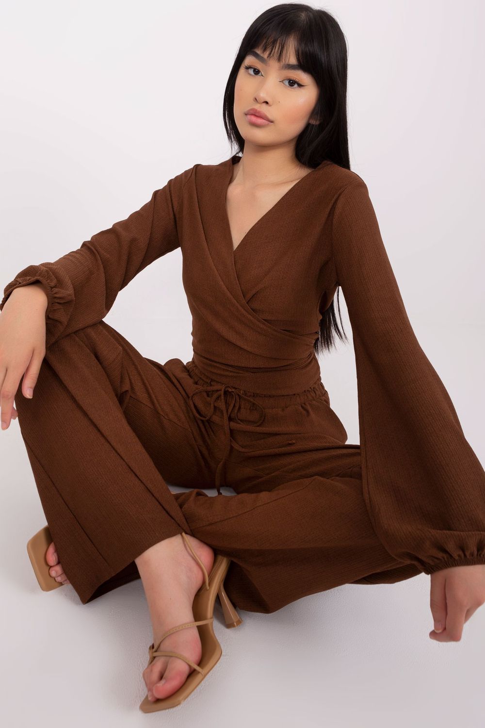 Un conjunto casual compuesto por blusa y pantalón. Blusa escalonada de manga larga y escote sobre en forma de corazón. Pantalón largo con lazo en la cintura, bolsillos abiertos a los lados. El set es ideal para el día a día y no solo.