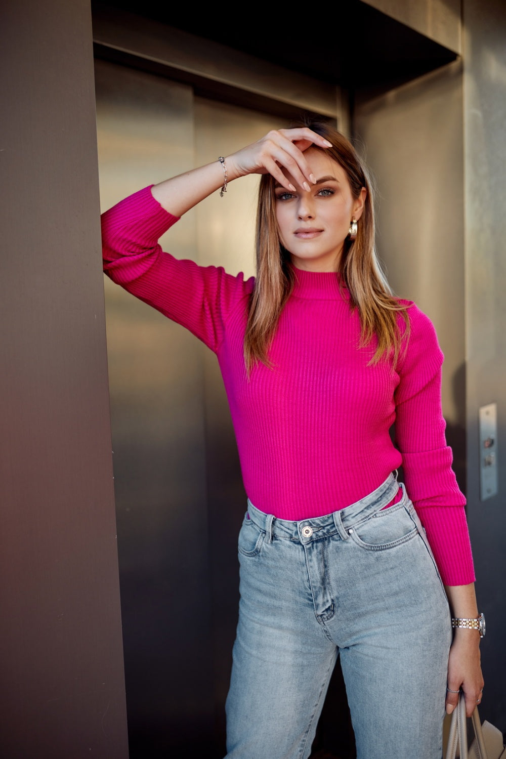 Jersey suave con medio cuello alto que se adapta perfectamente a cualquier figura. Jersey de manga larga en color amaranto. Este es un modelo clásico que te servirá durante muchas temporadas.