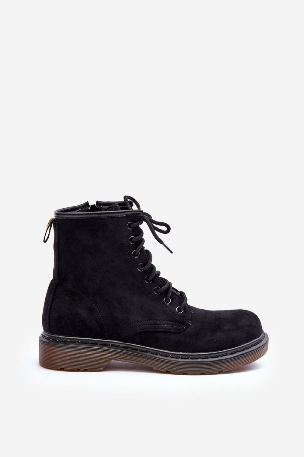 Las botas de mujer están hechas de ante ecológico. Tienen cremallera y cordones adicionales. Se asientan sobre un tacón plano y una plataforma. El contrafuerte del talón es más rígido. La suave plantilla de cuero ecológico garantiza la comodidad. ¡Este modelo complementará muchos de tus estilos!