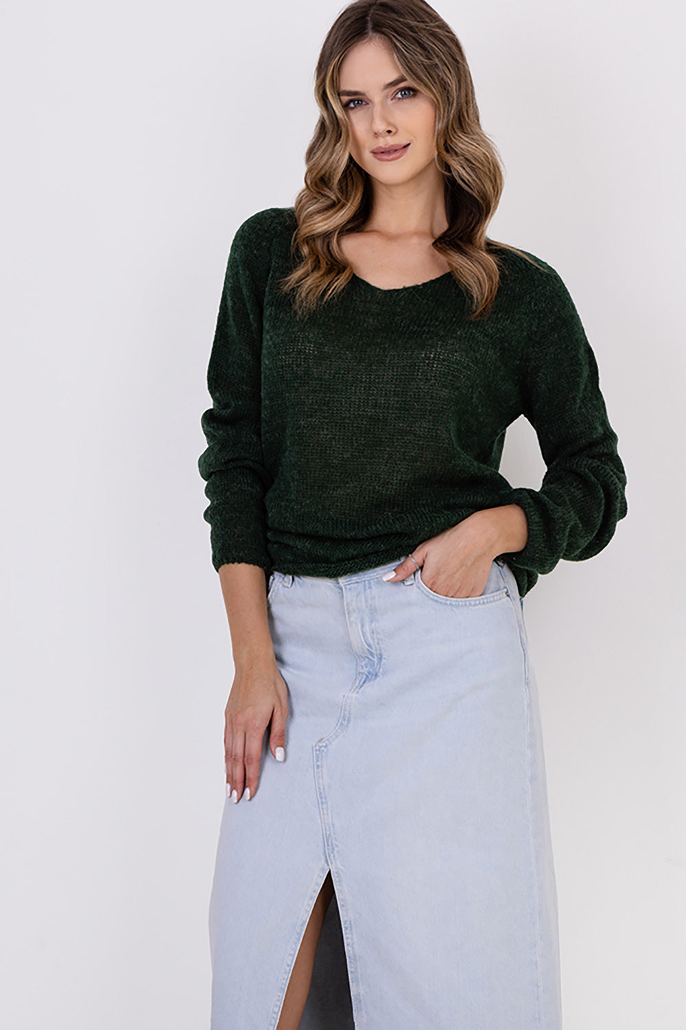 Ligero como la niebla, un suéter transparente con mangas raglán reemplazará con éxito una blusa elegante. Su corte holgado lo hace muy cómodo. La ausencia de adornos, su forma minimalista que combina con todo y para cualquier ocasión, y el escote pronunciado, hacen que se convierta en tu opción favorita para la temporada de frío.