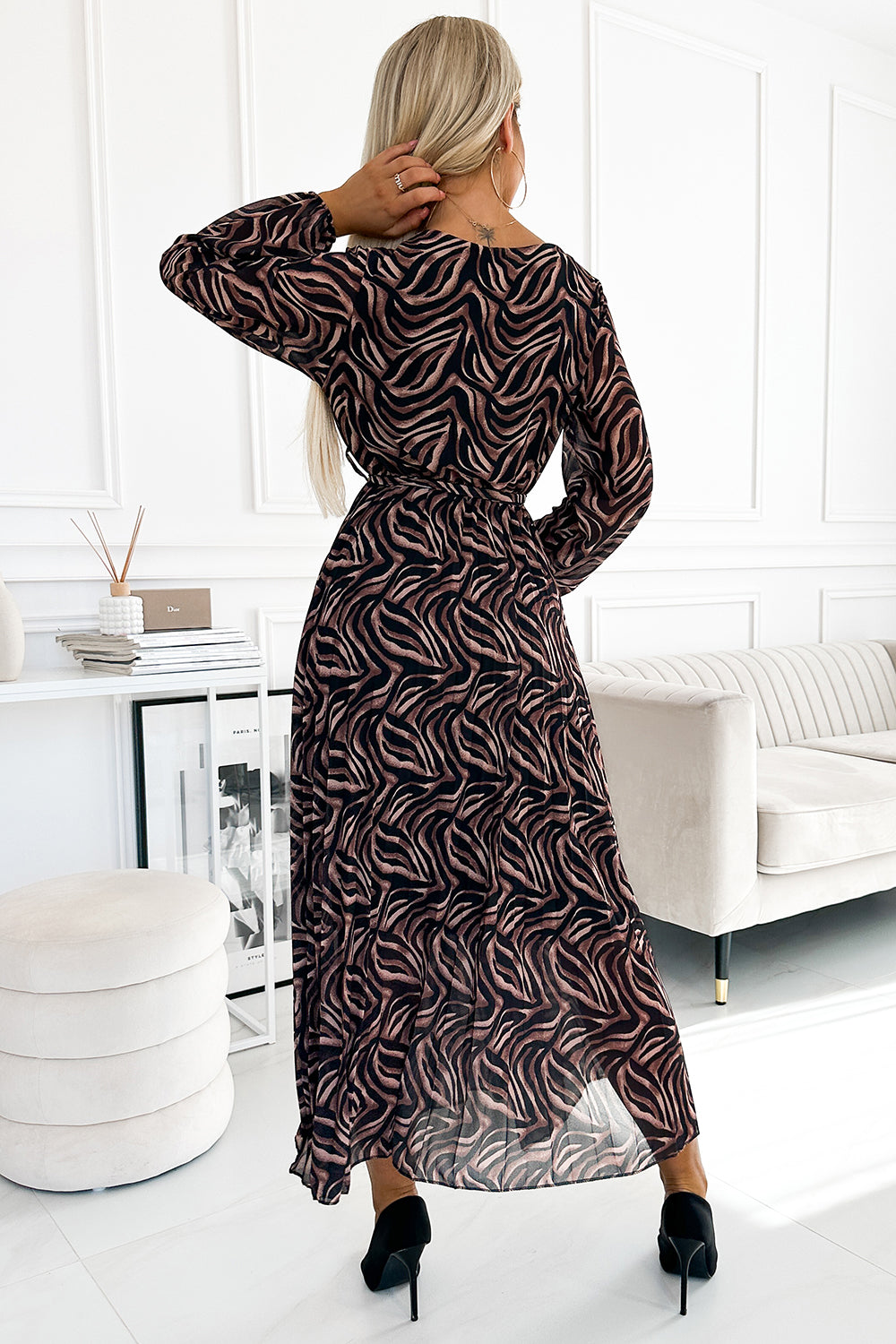 Vestido largo plisado con escote sobre, manga larga y cinturón anudado. Confeccionado en tejido de gasa sobre forro. Vestido confeccionado en tejido de cebra marrón. El vestido perfecto para cualquier ocasión. Marca numoco básica. Producción europea.