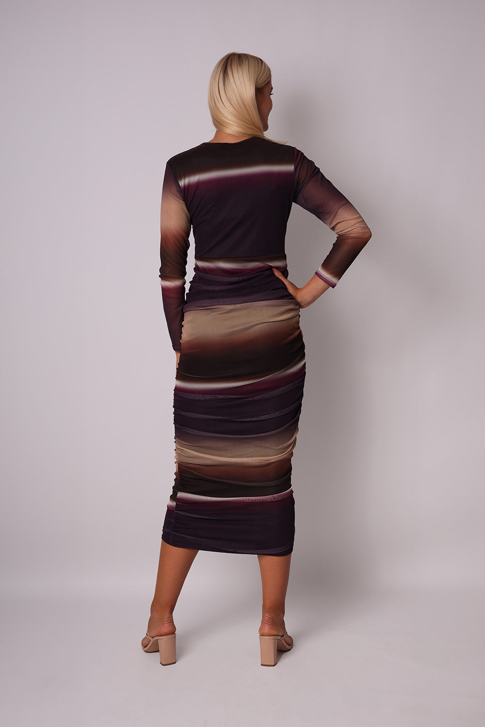 Luce elegante con nuestro vestido midi ajustado con mangas largas y estampado de malla en patrones abstractos de color ciruela. Tiene un top con volantes y una falda midi de malla forrada, mangas largas de malla y escote redondo. ¡Combínalo con joyas mínimas y tacones de aguja para completar el look!