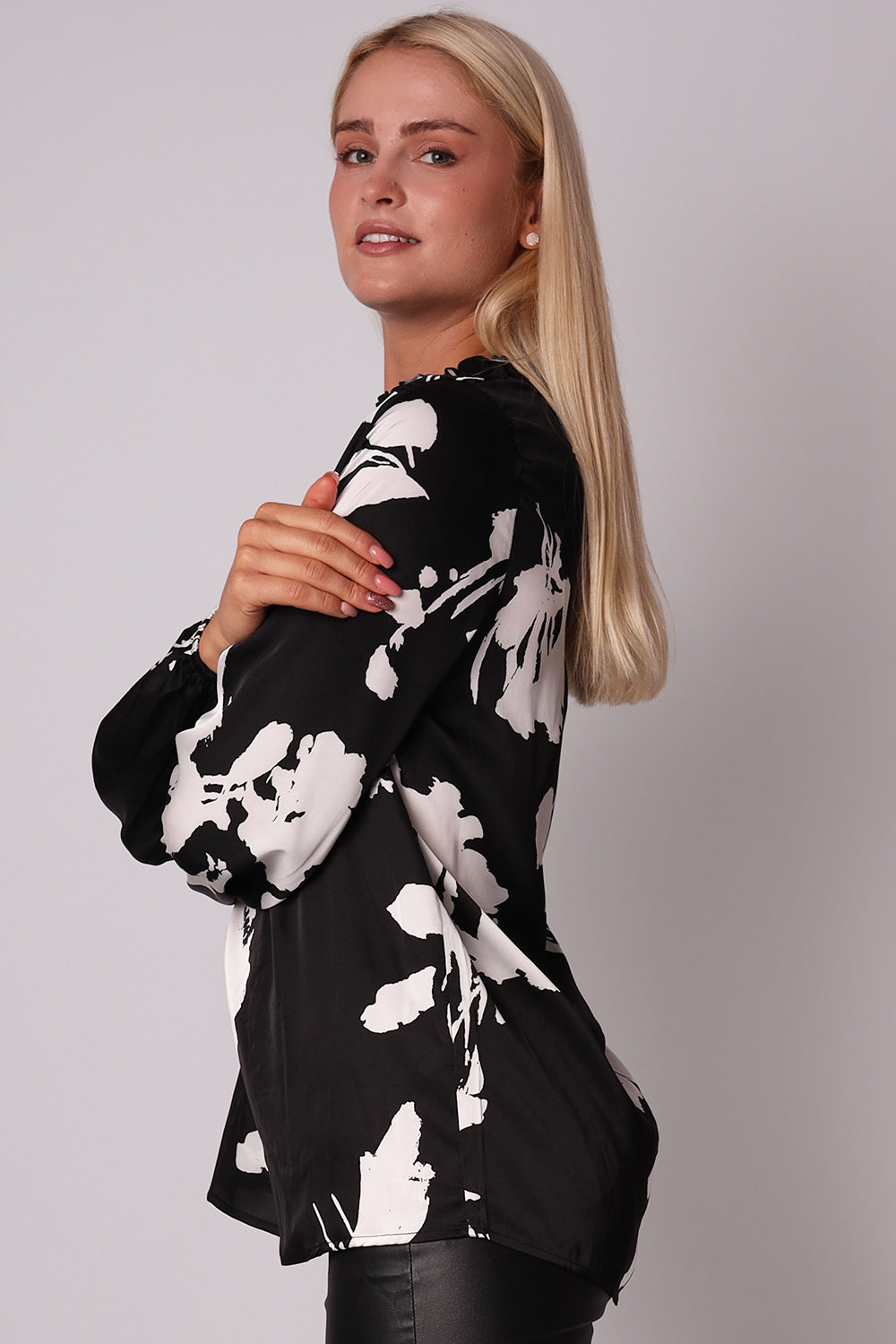 Esta blusa de manga larga con estampado de volantes en blanco y negro es la pieza perfecta para tu armario de diario. Tiene cuello bajo, cierre de botones y manga larga con puño elástico. Esta blusa es perfecta para el trabajo, el brunch, la cena con las chicas y las copas informales. Completa el estilismo con jeans o pantalones símil piel.