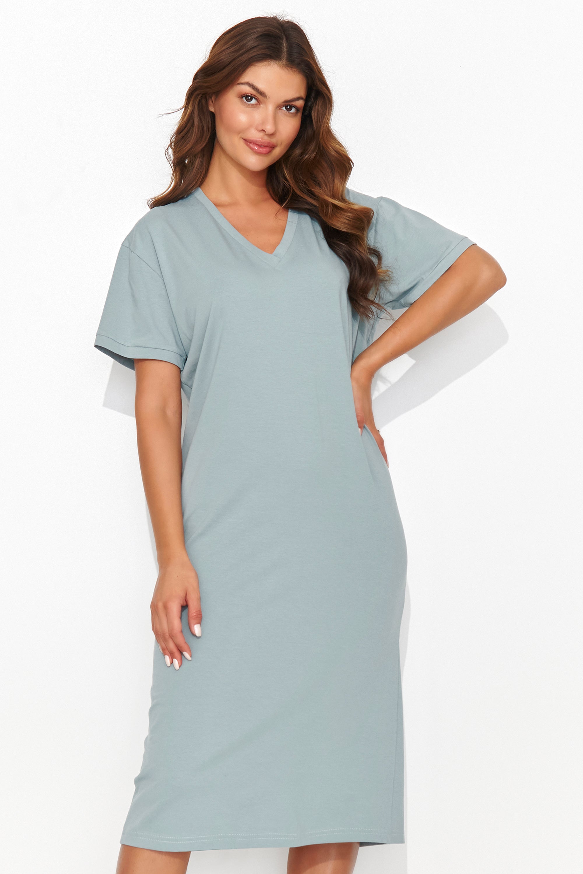 Vestido informal de punto con escote por detrás de la rodilla. Lleno de encanto y estilo informal. El vestido presenta una delicada abertura en la espalda que le aporta un sutil toque extravagante. Las mangas cortas e informales y el escote de corazón crean un aura de ligereza y comodidad. Un elemento decorativo adicional es el oropel cosido en la espalda, que le da un sutil toque de joyería. Este vestido de punto te permite crear un estilo único, perfecto para salidas diarias. Cómodo, moderno y con un encanto único, una creación veraniega que realzará tu personalidad.