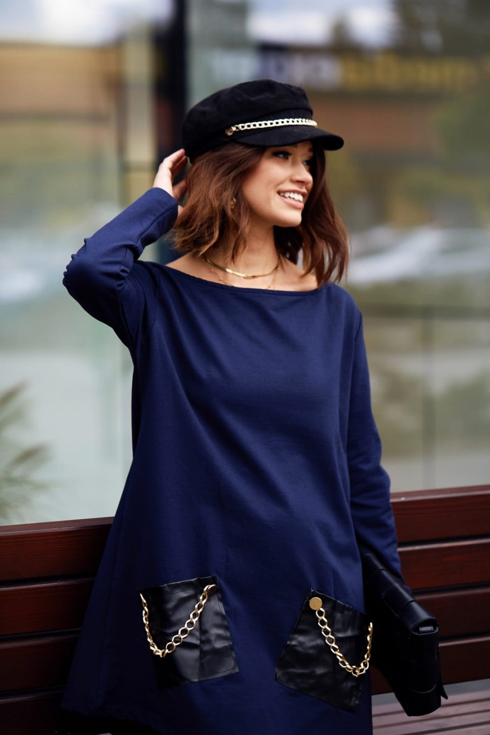 Vestido azul marino de corte holgado con bolsillos decorativos en la parte delantera. El vestido tiene mangas largas y cónicas. Combínalo con tus accesorios favoritos y crea tu propio estilo único.