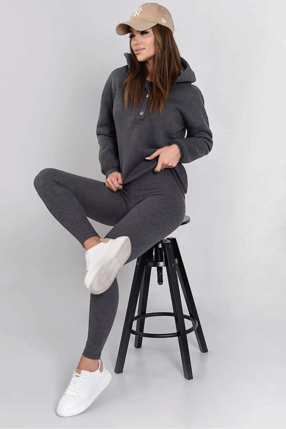 Conjunto de mujer compuesto por tres piezas, top elástico de rayas, leggings de tejido de rayas y sudadera con capucha aislante. La sudadera con capucha tiene capucha y mangas largas. El pantalón corto tiene tirantes anchos. Leggings con perneras cónicas y cinturilla elástica. Opta por un conjunto cómodo que te acompañará durante todo el año. ¡Deleitate con total libertad!