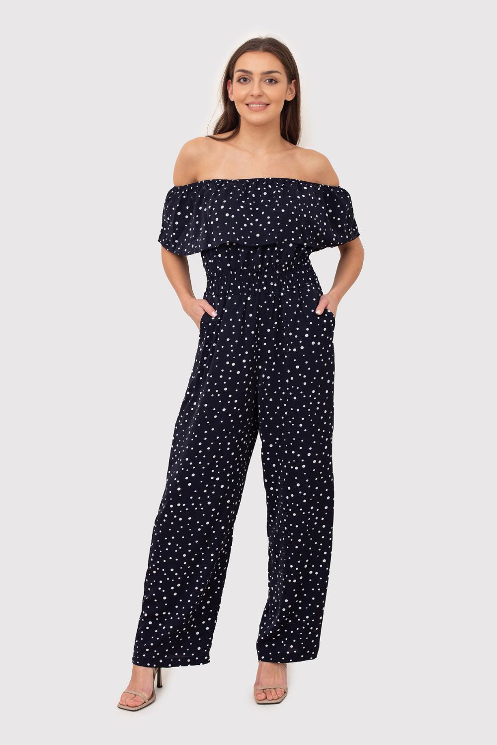 Mono bardot de lunares azul marino. Presenta corpiño estilo Bardot, cintura con volantes, perneras largas con bolsillos laterales.
