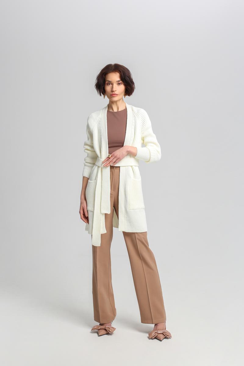 Cárdigan largo de manga larga, bolsillos y cinturón. Tejido acanalado.