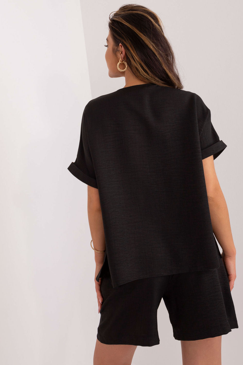 Este elegante y casual conjunto para mujer consta de camisa y shorts, perfecto para salidas diarias. Su diseño suave y la combinación de algodón y poliéster garantizan comodidad y durabilidad. Los shorts, de tiro alto, con pernera ancha y largo hasta la rodilla, realzan la silueta, mientras que los bolsillos laterales aportan practicidad. Las mangas cortas y el cuello en V de la camisa aportan ligereza y un estilo veraniego, mientras que los botones delanteros facilitan su colocación. Es la opción perfecta para los días cálidos, combinando comodidad y un look moderno.