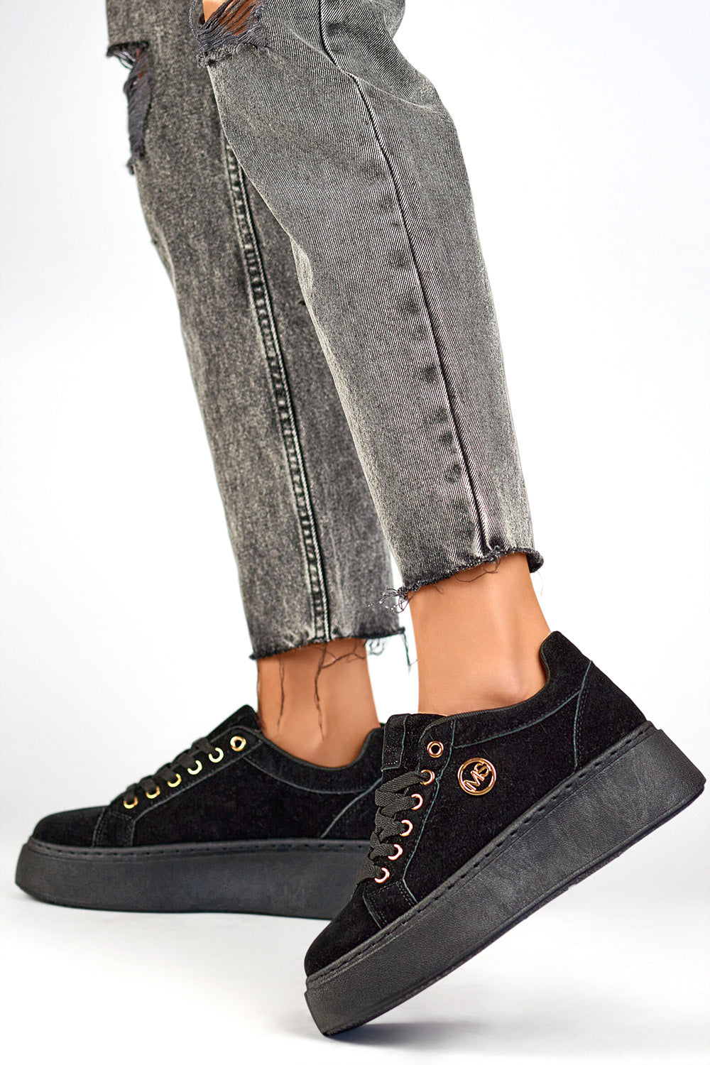 Las deportivas negras confeccionadas en ante ecológico son una opción elegante para mujer, ideal para todo el año. El modelo está equipado con cordones clásicos, que aseguran un buen ajuste al pie. La plantilla textil garantiza comodidad y transpirabilidad durante las actividades diarias. Los zapatos tienen una plataforma de 5,5 cm, lo que añade una altura sutil al mismo tiempo que garantiza comodidad. La puntera redonda acentúa el carácter deportivo de los zapatos, que serán perfectos tanto para actividades cotidianas como recreativas. La combinación perfecta de estilo y comodidad.