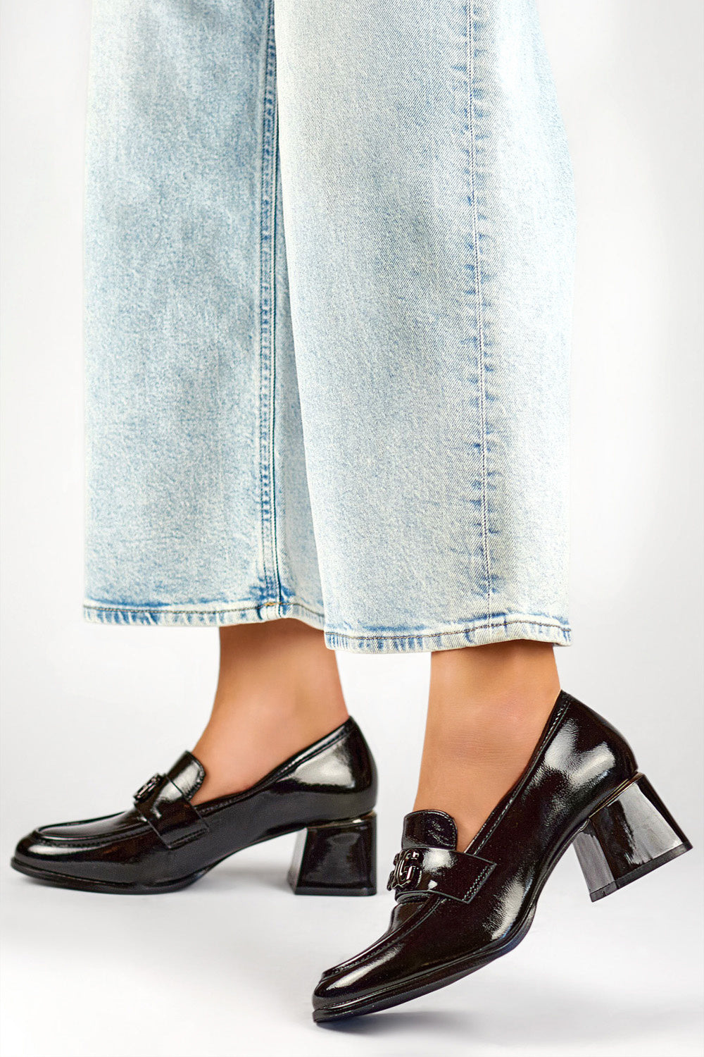 Los zapatos de salón de mujer negros fabricados en charol son una elección elegante ideal para diversas ocasiones. Su clásica punta redonda y su tacón estable en forma de poste de 7 centímetros garantizan comodidad y estilo durante todo el día. Gracias al diseño sin cordones, los zapatos son fáciles de calzar y la plantilla de cuero natural mejora aún más la comodidad. Estos zapatos de tacón versátiles son perfectos para la temporada primavera-verano, pero también serán adecuados para usar durante todo el año y combinan perfectamente con muchos estilos.