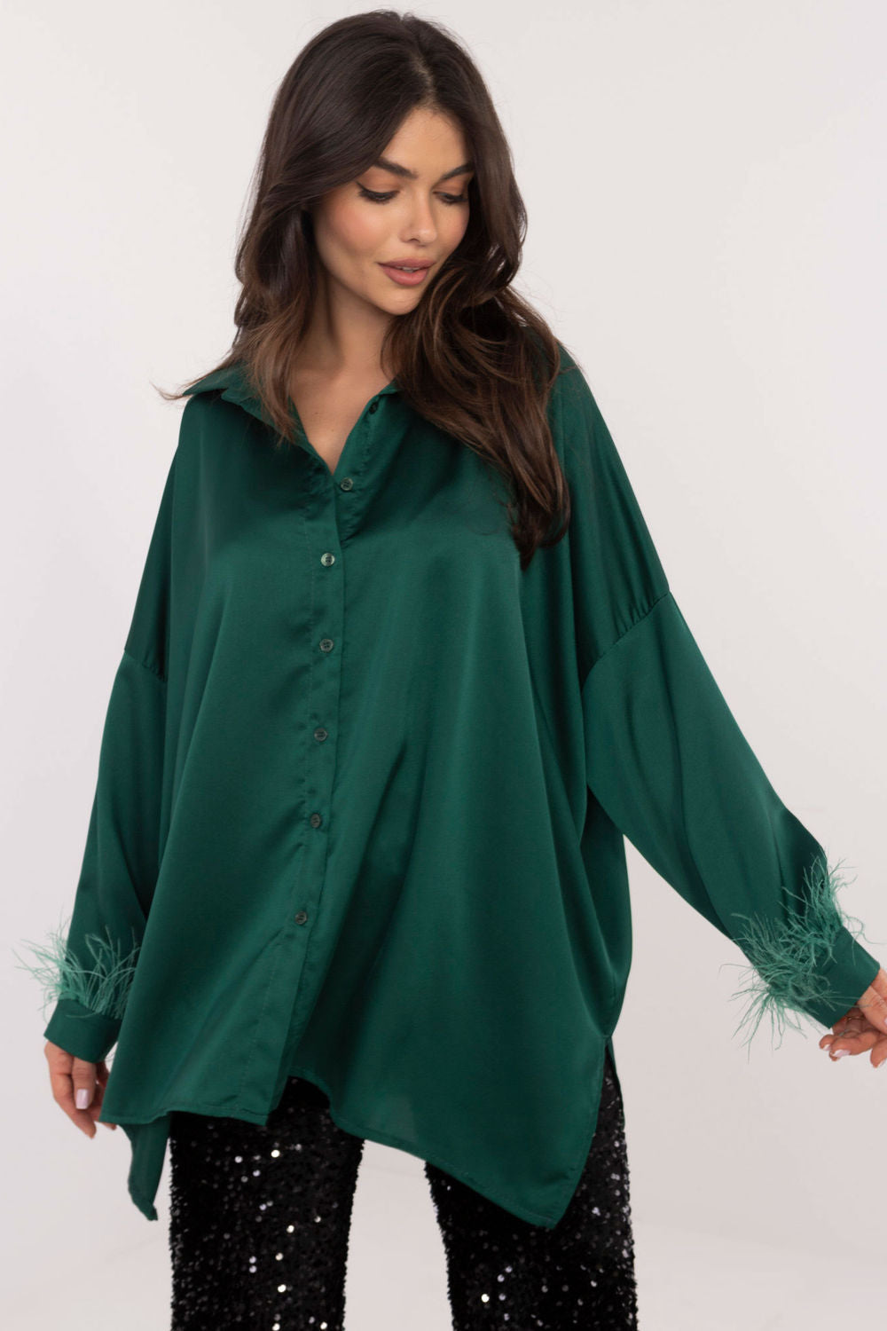 Una elegante camisa de mujer de corte clásico, diseñada para ocasiones especiales y estilizaciones de oficina. Confeccionado en una mezcla de poliéster y viscosa, garantiza comodidad y un look perfecto durante todo el día. El material liso enfatiza su estilo sutil y el largo añade elegancia y estiliza la silueta. La manga larga con puños adornados con plumas decorativas confiere a la camisa un carácter único y refinado, ideal para reuniones de negocios o salidas nocturnas. La camisa tiene un cuello clásico y aberturas laterales, lo que aporta ligereza y modernidad, mientras que el cierre de botones enfatiza su forma clásica. Se trata de una opción única para ocasiones elegantes, para el trabajo y para fiestas en las que quieras añadir un toque de extravagancia a tu conjunto.
