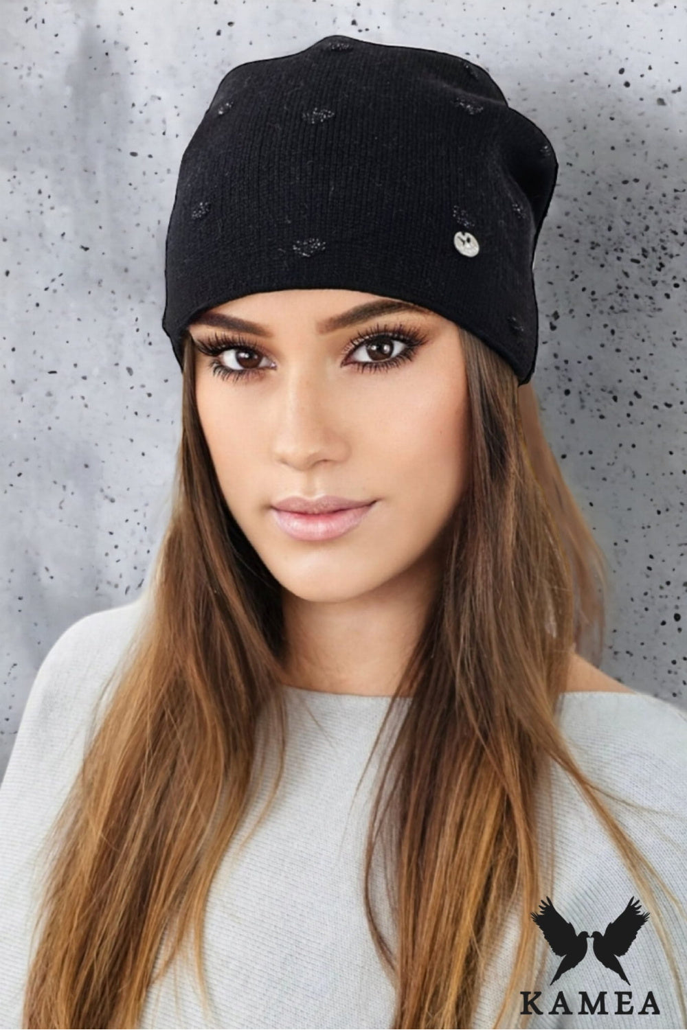 El gorro de invierno de lunares con brillo de GORCZYCA es la elección perfecta para los días fríos. El sombrero negro adornado con puntos en relieve de hilo brillante no sólo es elegante, sino también excepcionalmente suave y agradable al tacto. Confeccionado con hilo de alta calidad con un alto contenido de viscosa, proporcionará calidez y comodidad al usarlo. La forma atemporal del sombrero lo convierte en el complemento perfecto para cualquier conjunto de otoño-invierno. Disponible en varias opciones de colores diferentes para que todos puedan encontrar algo para ellos.