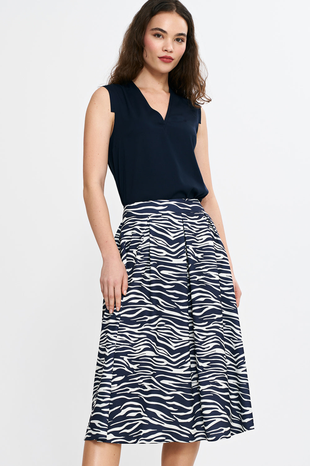 Elegante falda de corte regular y largo midi. Los elegantes pliegues decorativos en la cinturilla le dan un carácter único y realzan sutilmente la silueta. Incorpora prácticos bolsillos ocultos en las costuras laterales. Se cierra en la espalda con una práctica cremallera que garantiza comodidad y un ajuste perfecto. Clásica y versátil, perfecta tanto para looks casuales como elegantes.