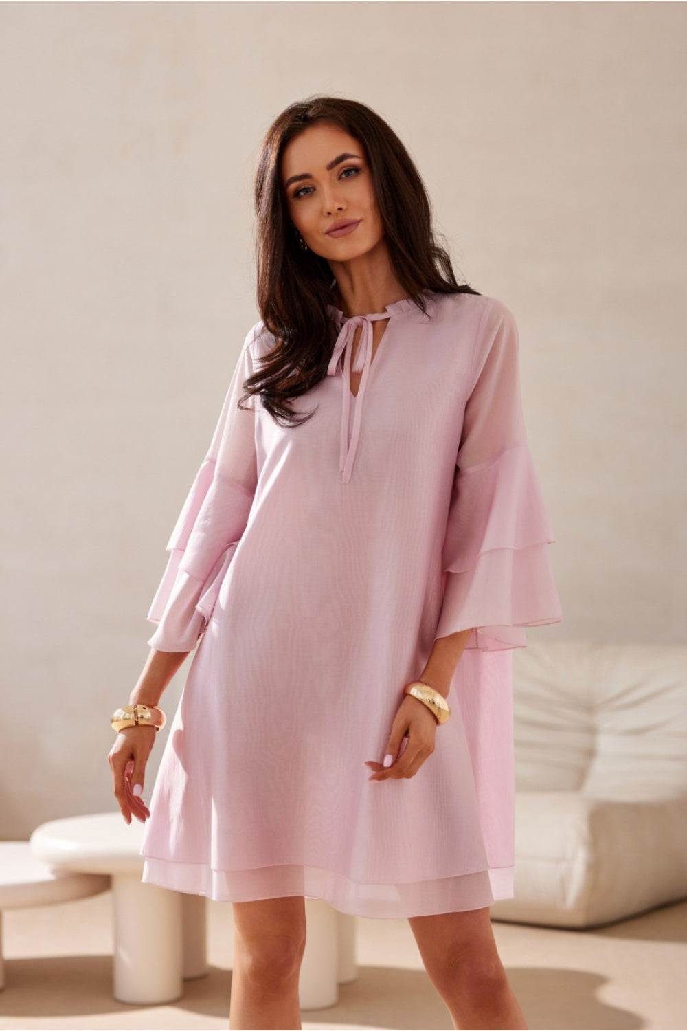 Vestido Beatrice de corte trapecio y largo hasta la rodilla, confeccionado en lyocell ligero y transpirable. El modelo presenta escote en V, cuello alto bajo y cordones. Las mangas 3/4, rematadas con doble volante, le aportan ligereza. El vestido se puede llevar suelto o anudado a la cintura con un cinturón ancho del mismo material, lo que permite ajustarlo a cualquier silueta.