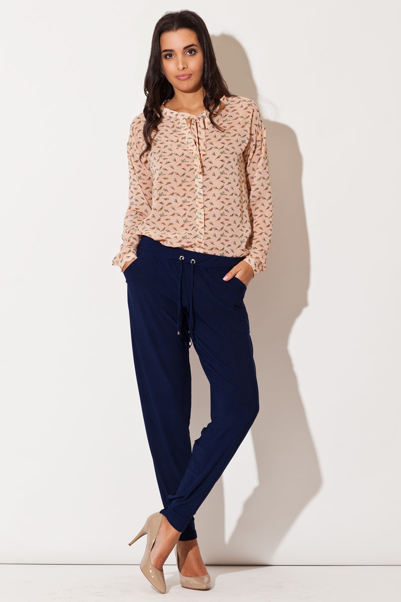 Elegante camisa de gasa de manga larga. Escote rematado con lazo. Camisa de corte holgado, abotonada. La camisa está confeccionada en una delicada tela translúcida con pájaros.
