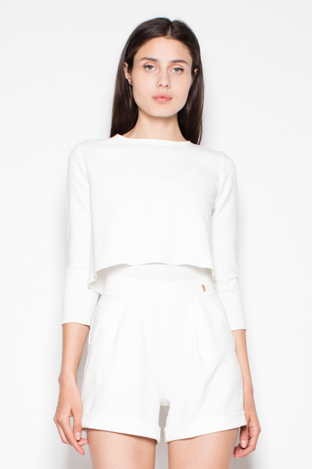 Elegante mono de dos capas con shorts cortos sin tirantes. El top, de manga larga, se lleva por delante y se cierra con corchetes en la espalda. El modelo tiene un corte original.