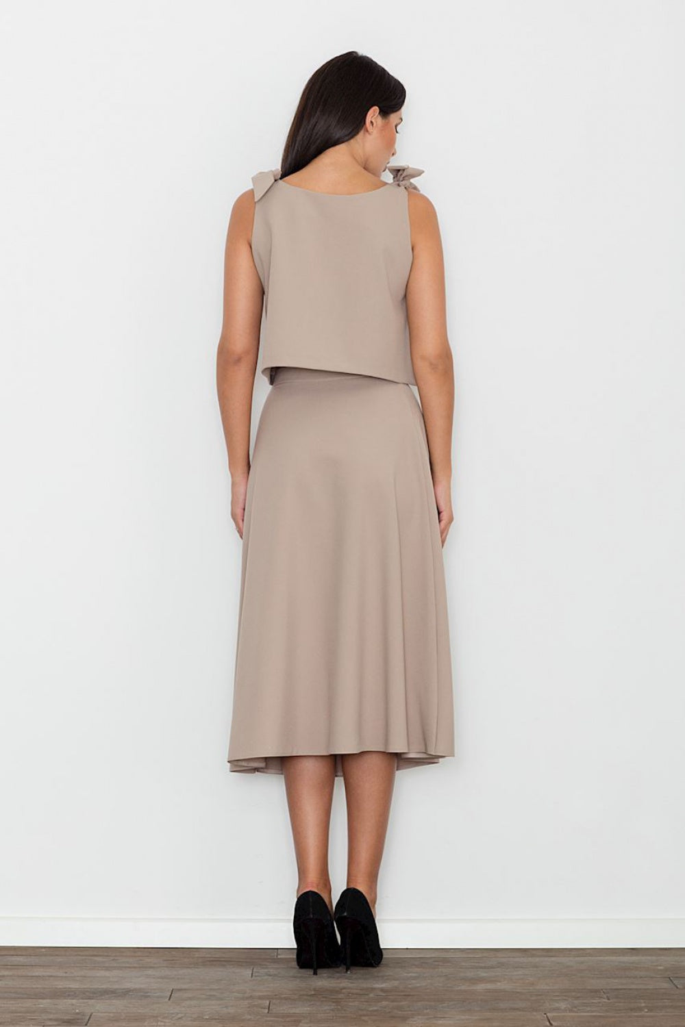 Un elegante conjunto con falda. Su corte favorecedor aporta comodidad a diario. Es recta, con vuelo hasta media pantorrilla y cremallera oculta en la espalda. La parte superior es holgada, con lazos decorativos y se ata a los hombros. Ideal para quienes buscan un look moderno y a la moda.