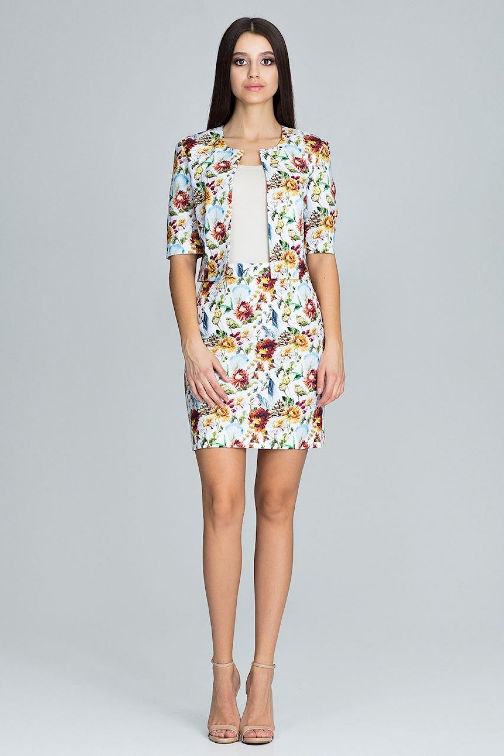 Un conjunto fantástico con estampados florales. Una falda por debajo de la rodilla y una chaqueta con mangas 3/4 son una excelente opción para una mujer a la moda. Su material ligero aporta elegancia y comodidad.