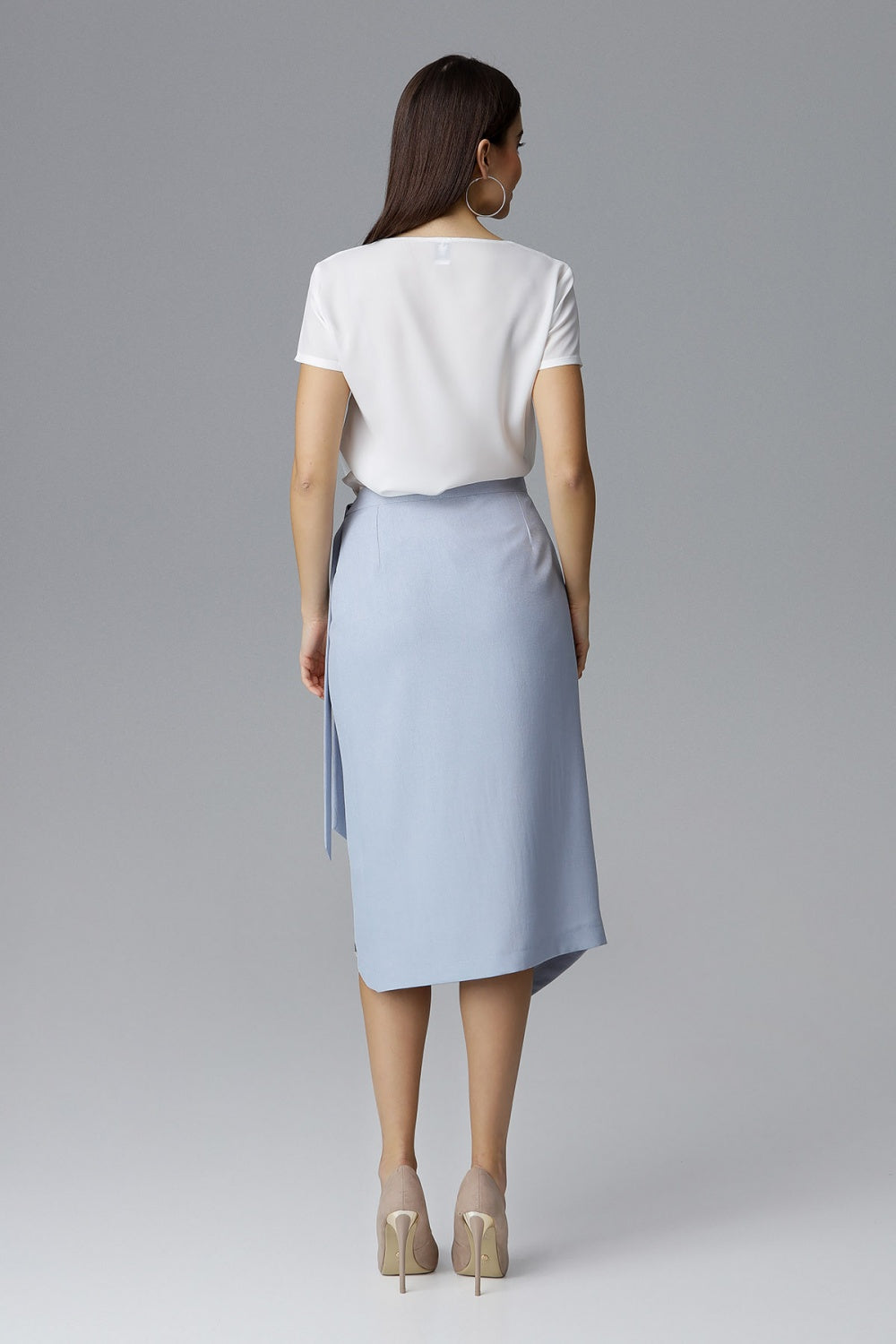 Falda asimétrica que se lleva del lado izquierdo y se anuda a la cintura. Combina con tacones de aguja, botas o botines.
