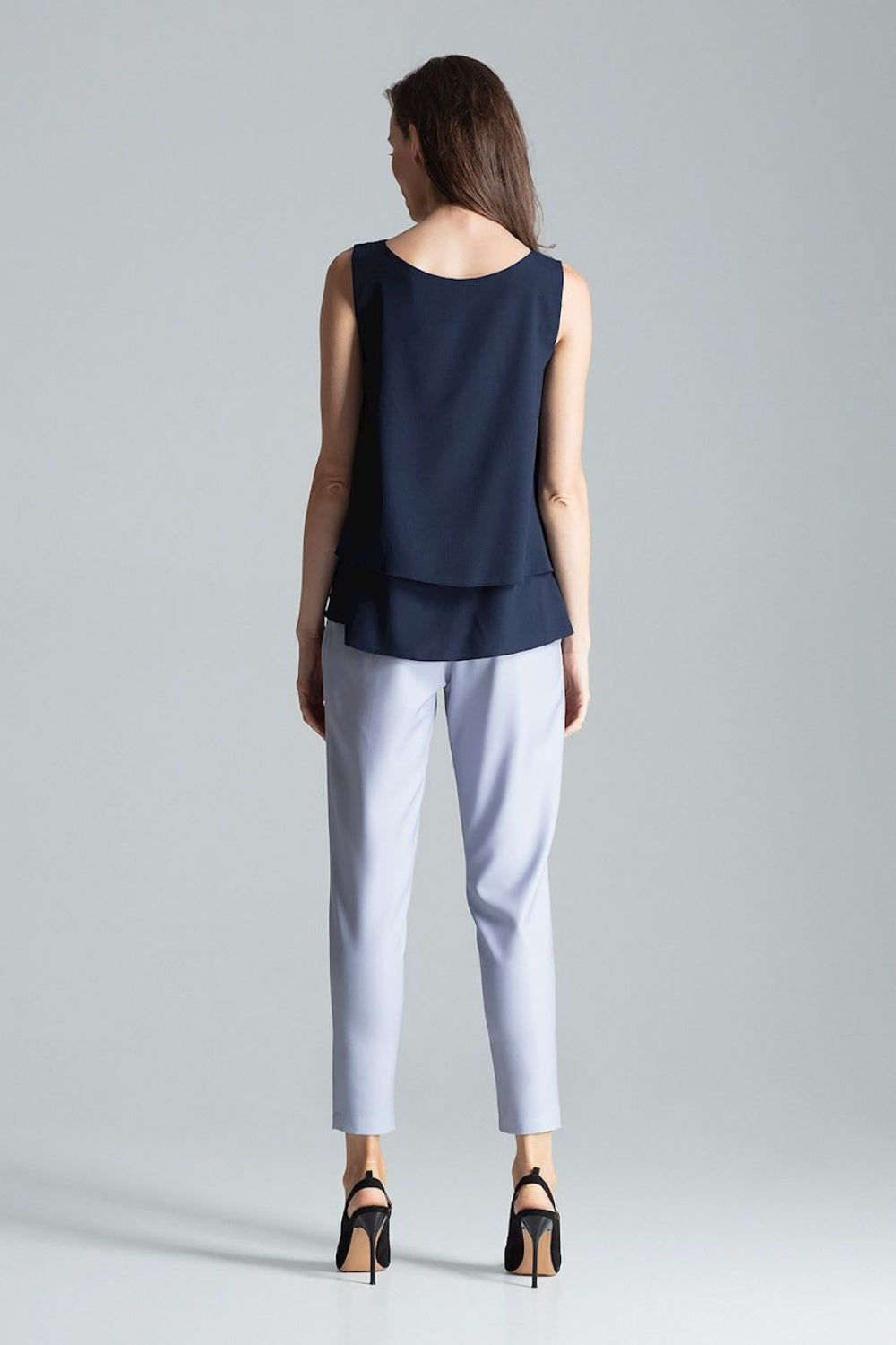 Encantadora blusa azul marino sin mangas de doble capa con escote medio redondo y acampanado hasta la parte inferior.
