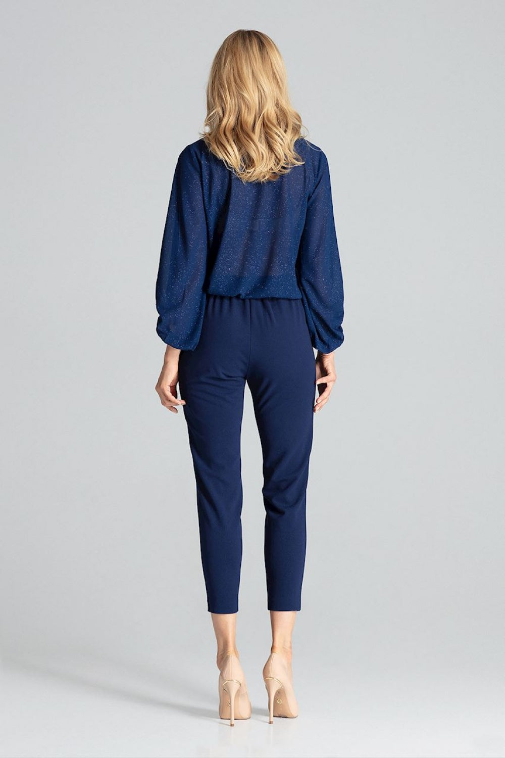 Pantalón azul marino de mujer con rayas brocadas, perneras ligeramente ajustadas. Cintura elástica ancha en la parte trasera, sin bolsillos.