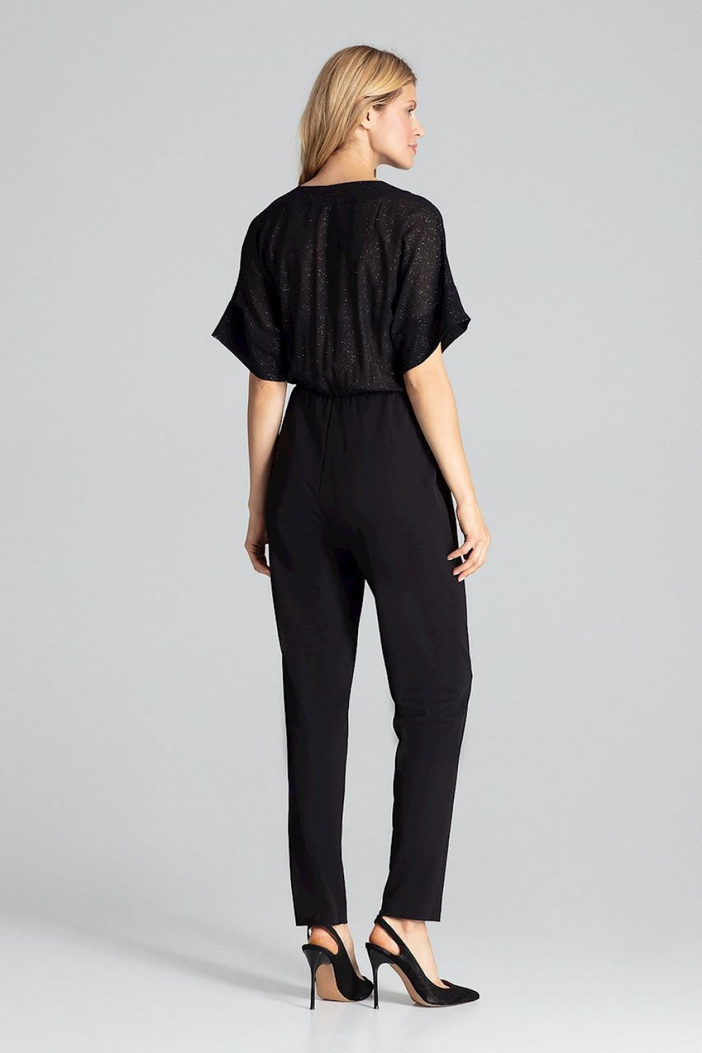 Mono elegante negro. Top de brocado con mangas cortas y caídas, escote envolvente, cintura con pliegues y banda elástica cosida, sin bolsillos y perneras ligeramente estrechadas hacia el bajo.